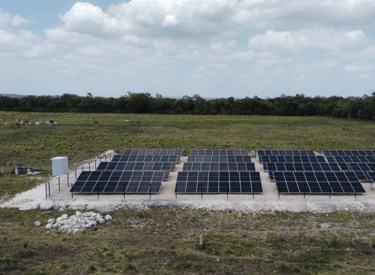 Sistema fotovoltaíco autónomo de 128 paneles de 450 W, para accionar una bomba de 40 HP. Energia generada: 57.6 KWP Estructura de columnas de concreto, acero galvanizado y rieles de aluminio anodizado.