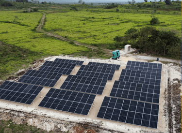 Sistema fotovoltaíco autónomo de 128 paneles de 550 W, para accionar una bomba de 50 HP. Energia generada: 70.4 KWP Estructura de columnas de concreto, acero galvanizado y rieles de aluminio anodizado.