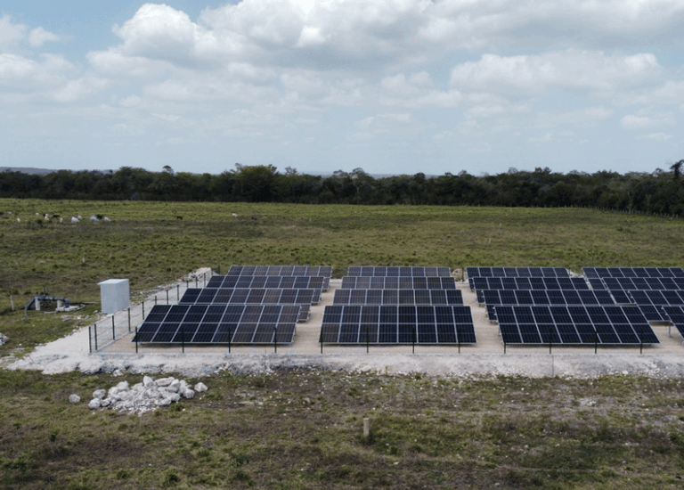 Sistema fotovoltaíco autónomo de 256 paneles de 550 W, para accionar una bomba de 100 HP. Energia generada: 140.8 KW. Estructura de columnas de concreto, acero galvanizado y rieles de aluminio anodizado.